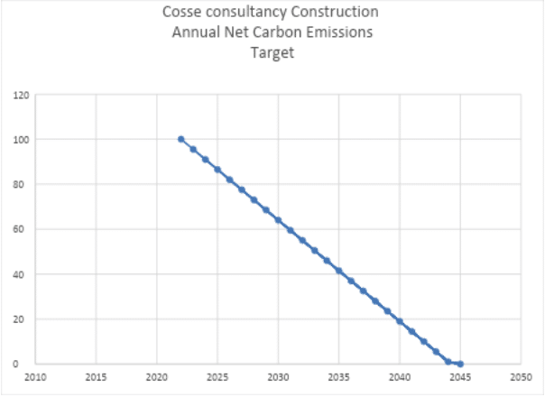 Cosse Consultancy have chosen a stepped approach to our carbon reduction plan. This approach will see us target to achieve at least a 4.5% reduction in each year between 2024 and this will ensure we achieve net zero by 2045.
